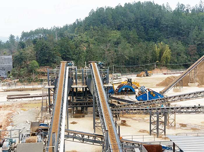 1、物料通過圓振篩篩分后通過溜槽進入到多功能一體機進行洗砂并脫水,脫水后的成品砂通過傳送帶運至成品堆場;