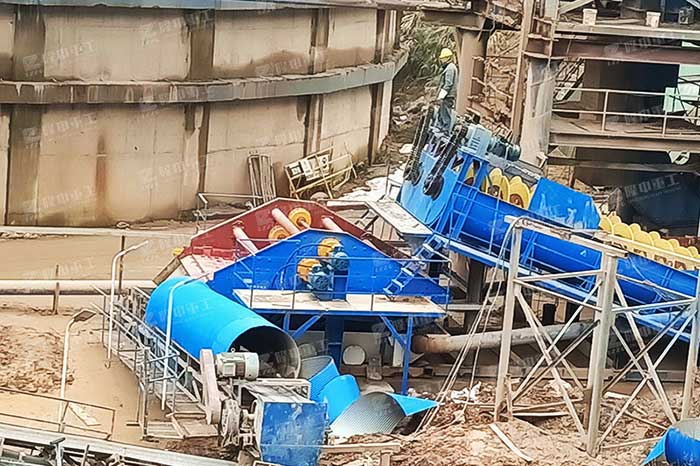 實(shí)際生產(chǎn)中,洗砂機(jī)一般會(huì)和脫水篩配套使用。因?yàn)榻?jīng)過(guò)洗砂機(jī)清洗的砂子其實(shí)并不干凈,還有很多泥和水,并不能滿足生產(chǎn)需要。
