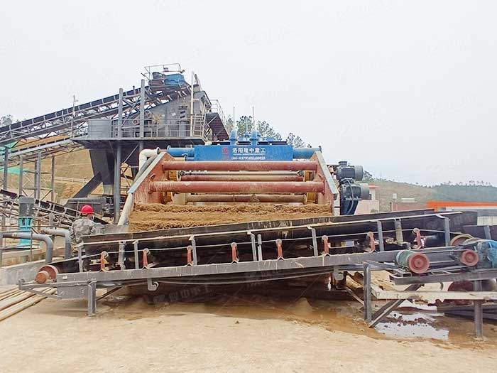 在濕制砂工藝生產(chǎn)線中,洗砂機(jī)洗過的砂不是很干凈,砂中含泥量大,含水量也比較大,不能實(shí)現(xiàn)機(jī)制砂的生產(chǎn)需要。因此,此時(shí)需要對(duì)振動(dòng)脫水篩進(jìn)行二次沖砂、脫泥、脫水等工序,以達(dá)到合理的粒徑比,將含泥量和含水量降至原水平生產(chǎn)標(biāo)準(zhǔn)。